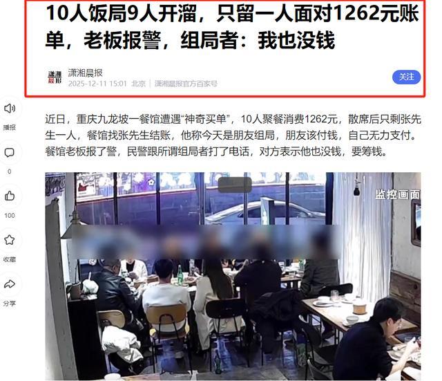 “饭吃完了,大家都跑了,只剩下我一个人站在那儿付账了!”都说森林大了,各种鸟儿都有,人多了,就有各种奇怪的东西。明明是一场十位“朋友”热闹的聚餐,结果却是一场“鸿门宴”。 20个菜和茶一共花了1262元。报案后不久,9人就以各种借口逃跑,张先生留在了原地。当时全网都在喊张先生的冤屈,骂留单的人无良,但谁也没想到,剧情却反目成仇。世界上正在发生什么? 12月4日晚上,专营云南菜的小餐馆里燃放了许多烟花。清楚地记得店长郑先生,下午四点左右,两人提前打电话预定了座位。理由是“10人聚会必须共用一张桌子”店长一听,觉得这是一个大胆的举动,立即答应了。下午5点左右,大家聚集在两张大桌子前,把菜单上的硬菜都点了。从晚上一直到深夜11点40分,满桌子都是欢声笑语,没有人发现有什么异常。这时候,服务员过来续茶,被他们热情招呼“再加点”。对此,郑先生也很高兴,想着自己现在是有一笔大单,没想到到了10:00左右,人就开始离开了,毕竟现在还有人在吃大蒜,所以老板和员工应该忙着自己的事情吧,直到关店的时候,服务人员才过来告诉张先生,关店了。我还以为是张付钱呢。附庸风雅的人会扔掉账单然后走开。谁知对方说下一次,服务员大吃一惊。对方表示,他不是请吃饭的人。如果他付了帐单,他就会被利用。于是张先生表示不付钱。服务员听后,立即打电话给老板,让张先生付钱。毕竟,俗话说,做生意,在郑先生看来,自己只是一个商人,不是调解高手,更不理解他们的恩怨怨怨。至于谁修游戏,谁治病,这是张先生自己的事。张先生可以给钱,慢慢跟他们解决问题,而不用为他们埋怨。我不是一个有钱人。我靠开小店赚辛苦钱,还要交店里的水费、电费、养活员工。一千多块钱对于我来说可不是一个小数目。如果这是一个正常人,他一定会付出代价然后二话不说就离开了,然后和其他9个朋友“安顿下来”。但张先生不知道是因为他的性格还是其他因素。面对店主提出的解决方案,张先生继续表示自己“非常错误”。这顿饭你不应该邀请自己,你是受邀的客人。对方见老板不付钱,就改口说明天会联系主办方,让他付伙食费。让他等到明天到来,一切再商量吧。张是左人吗?对不起。他说他没有钱,也不会付食物费。自己三十多岁了,现在还买不起一千多块钱吗?张老板离开了,老板很担心,于是就启动了张先生。张先生挂了电话,似乎不愿意再说话,这让郑先生很无奈。没想到到现在,还有人放心地吃大蒜食品。至于张先生的身份证号码抵押在这里的,郑先生说没用。不行他可以暴露自己的身份证。当另一方起诉他侵犯肖像权时,那就更困难了。郑先生无奈,只好将此事告诉媒体,希望借助媒体和舆论的力量,帮助他追回应得的钱,避免损失。张先生没有拒绝记者的电话。但他的态度依然坚定。无论对方说什么,对方总是会有同样的行为。如果修复游戏的人不给他转账,他将如何付款?同时,张先生还反复强调,自己只是一个请客吃饭的人,应该去找安排比赛的人付钱。事件曝光后,网友们也是议论纷纷,不少网友直呼大开眼界。互联网也分为三个主要派别。一组人认为张先生也是受害者,并认为张先生是受害人。无法独自承担损失。责任在于他的朋友和那些修复游戏的人。但有人说,没有人会无缘无故地这么做。对方这么做一定是有原因的。这可能被张先生利用了,于是9人联合起来教训张先生。当然,这只是网友的猜测,没有任何依据。许多人对他们的老板感到难过。他们相信,做出承诺就必须遵守,不能因为朋友不诚实而让店主消失。对此,专业律师表示,张先生在警方见证下签署的承诺书具有合法有效的民事合同效力,是其真实意思表示。他必须按照约定支付餐费。同时,有律师表示,这方面有两个责任需要区分。从法律角度看,10人聚集就构成“共同消费”作为服务提供者,餐厅有权向在场的任何消费者追偿。这在民法上称为“连带责任”。张先生支付餐费后,可以凭消费凭证和承诺书向其他9人追回每人126.2元的分摊费用。但他不能以“朋友不付”为由拒绝向餐厅履行付款义务。毕竟,餐厅没有义务。如果餐馆还没有收到钱,可以采取法律行动来维护自己的权利。目前,餐馆老板郑先生还没有收到这笔钱,但从老板的态度来看,他恐怕不会放过他们,到时候他们要告上法庭,或者每人100多元,这些人肯定会被视为当地名人。想一想出了这件事吗?你有奇怪的朋友或顾客吗?参考文献